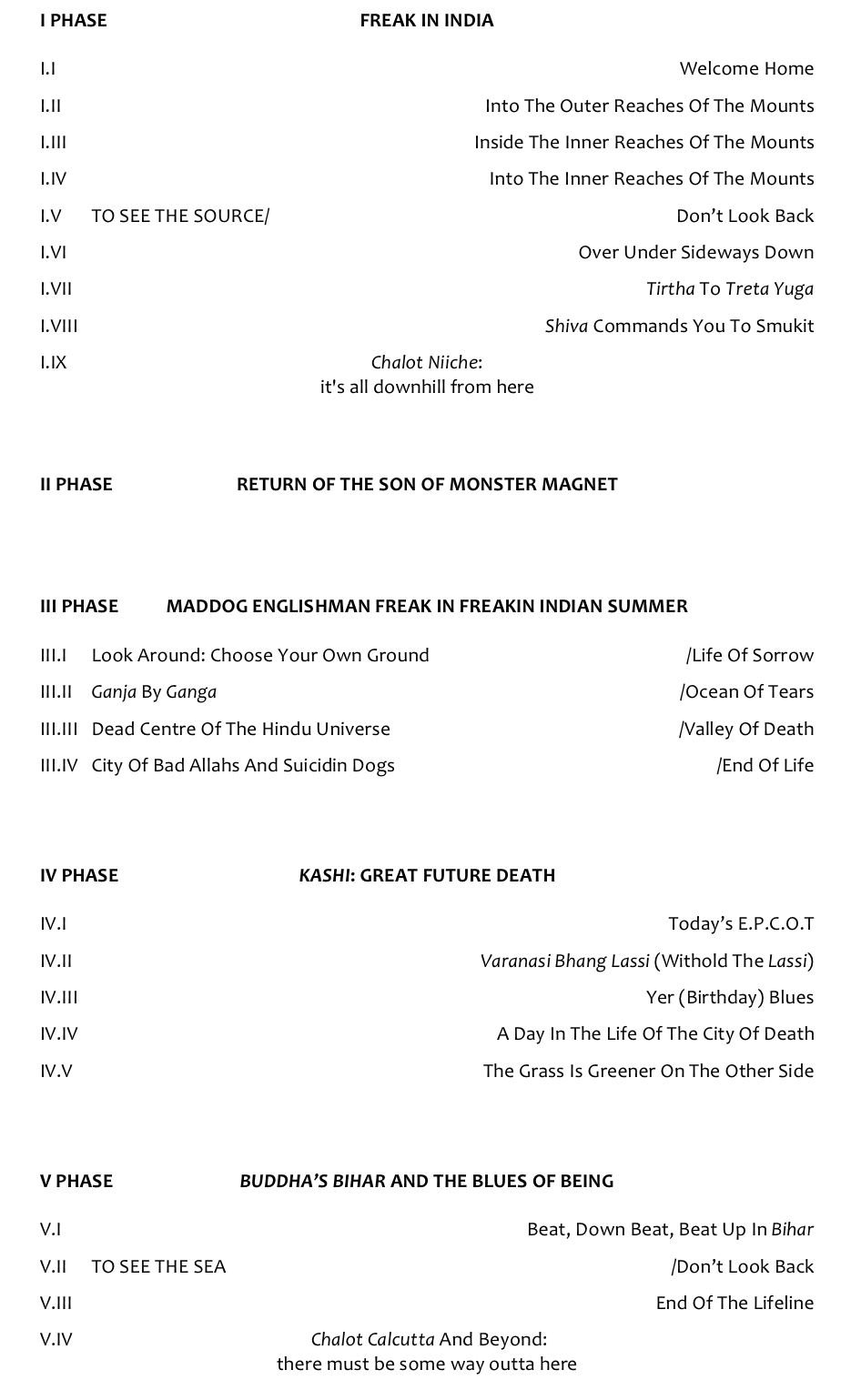 The following is the list of chapter titles in the structure of 4 Stages, each corresponding to the size of the stages of the Parvati Valley Hydroelectric Projects.